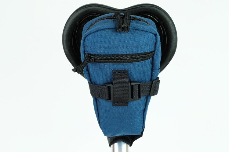 Description: The Mini Mountain Wedge is packed full of great features, designed to stand up to the rigors of serious on- and off-road cycling. The three-point suspension system consists of a seat post hook-and-loop strap and a 3/4" main webbing strap that threads over each seat rail. A side-squeeze buckle allows for easy removal. A new design feature is the perpendicular strip of webbing on the bottom that keeps a lightly packed wedge from popping out. With added durability in mind, we have lined the wear points of the bag with a layer of SuperTexâ„¢ vinyl scrim. All seams are taped to prevent fraying, and stealth zipper heads provide a quiet ride. We even threw in a quick-access key pocket under the wedge for convenience.